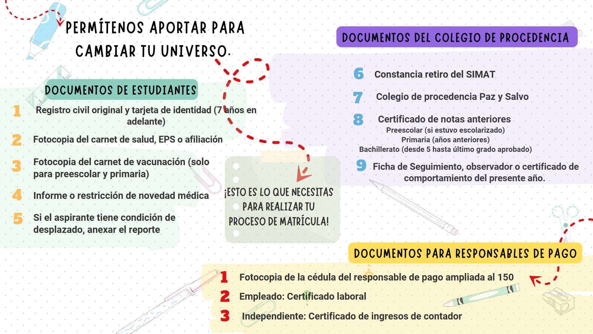 Información académica y financiera información sobre servicios complementarios, proyecto educativo, seguro estudiantil, transporte, almuerzos, lonchera, útiles escolares, uniformes.